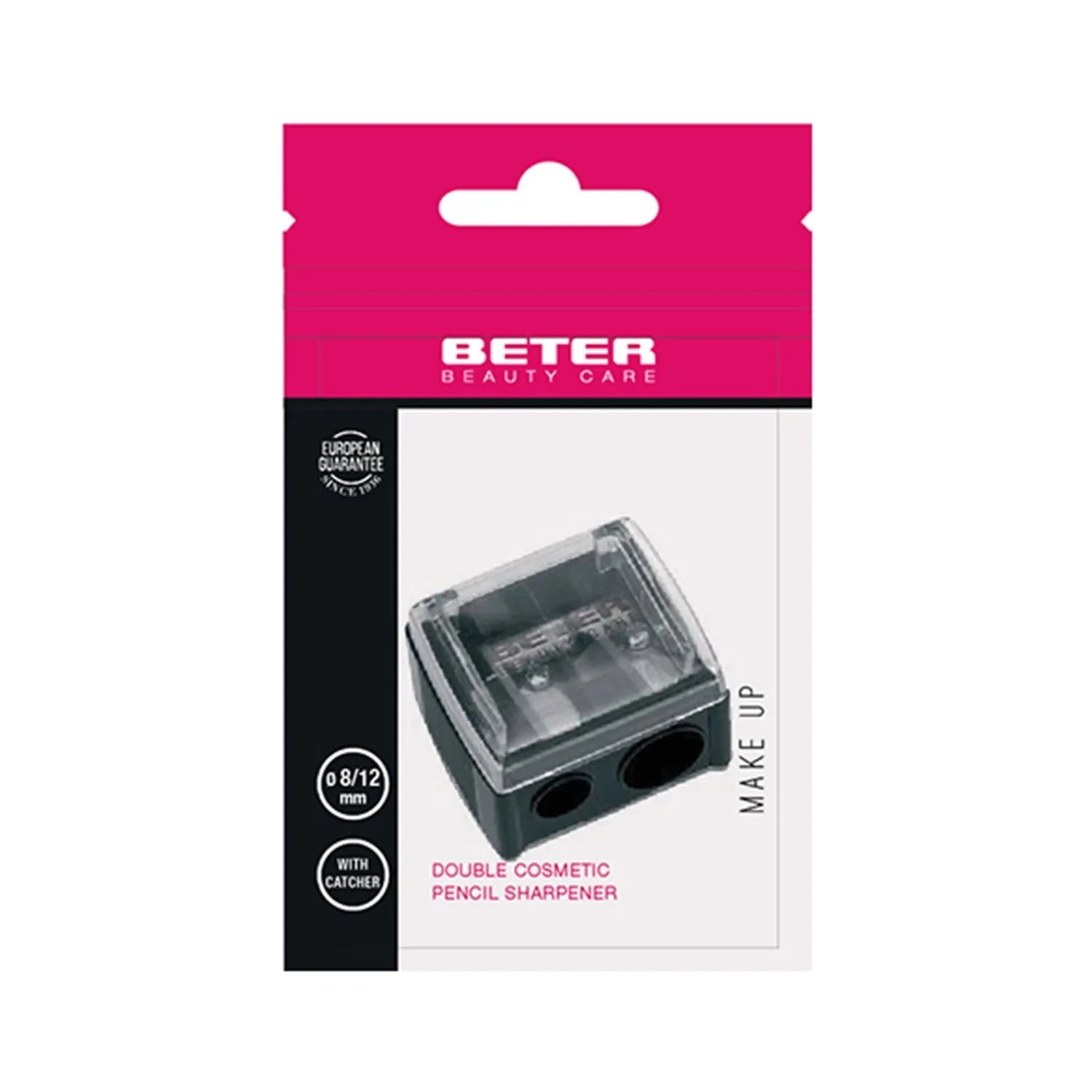 Beter Doppel-Kosmetikstiftspitzer für Kosmetikstifte mit einem Stiftdurchmesser von 8 bis 12 mm. Der Beter Sharpener bietet scharfe Spitzen für alle Ihre Augenbrauen-, Wimpern- und Lippenstifte mit einem kleinen Hebel an der Seite. Der kosmetische Bleistiftspitzer besteht aus einer Klinge aus Kohlenstoffstahl, die jeden Bleistifttyp perfektioniert. Während der Kunststoffeinsatz ein einfaches Reinigen und Nachschärfen während des Gebrauchs ermöglicht, erleichtert die ergonomische Form dieses Spitzers die Handhabung während des Gebrauchs. Seine verstellbaren Kanten sorgen für ein faires und effektives Schärfen.